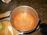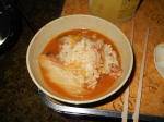 煮えて来ましたキムチ鍋。スープはキムチゲ、白菜、おでんセット、ウインナー、浦村産の牡蠣、豚肉細切れが入ってます。用心に自宅からプチと鍋のキムチを持参。 |