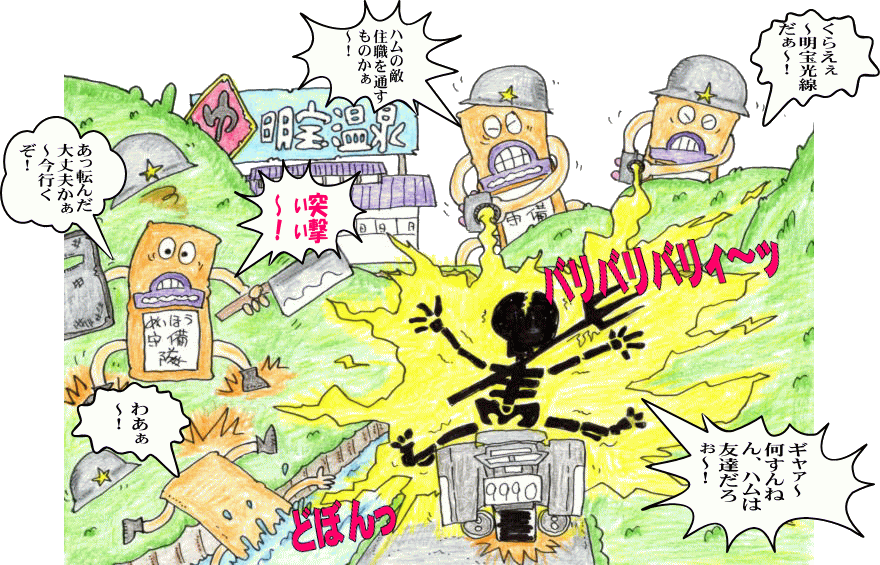 | アマチュア無線を少しは楽しむ私は明宝ハムを食べ尽くすべくハム串刺し専用フォークを背負って明宝温泉を目指した。が、食の世界を我が物にしようとする悪巧みがバレたのか明宝ハム軍団の攻撃を受けてしまった。さぁぁ~どうなる住職さん、その運命やいかに・・・。 |