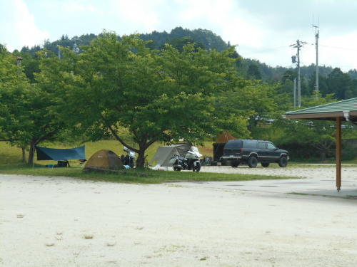 四角く仕切ったグランドのような広場の木立と芝生があるサイトに二人のバイクとテントがあり、私はその横に乗り付けた。二人はレストランで食事中だ。「早く来い」と言うが「設営したら行くよ」とまずは設営を優先した。 だってぇ~温泉入って飯食ってから汗をかくのは嫌だよね。 |