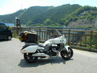 矢作川沿いのコーナーを楽しみ久しぶりの矢作ダムで休憩とした。車が数台停まっているのみでダム周りの景色を堪能する。名古屋よりは気温は低いのだろうが暑い。 |
