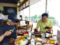 私はお気に入りのエビフライ定食を注文、石さんも同じで松さんは煮魚定食でした。エビフライ定食には大きなエビフライが三本入り美味しいですよ。食後のコーヒーを飲みながらの三河湾一望の眺めも気持ち良いです。 |