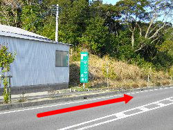 | また直ぐ、マリンサイド志摩とシャロームへ右折の看板があり矢印のように右折。 | 道は狭くなるが舗装は綺麗。これを30〜40bほど進むと変則十字路へ出る。 | 変則十字路を右折する。 |