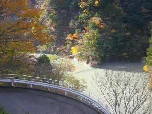 | 県道で大井川沿いを上り塩郷の吊り橋を過ぎるとナビが「左折です」を繰り返す。 が、曲がる道が見あたらない。三回往復して分からすでキャンプ場のホームページからプリントアウトした地図でやっと分かる。 右写真の後方にある塩郷ダムの狭いダム道路を通るのだった。せまいので対向車が来るとお見合いとなる。写真は渡りきった側から写した。 |